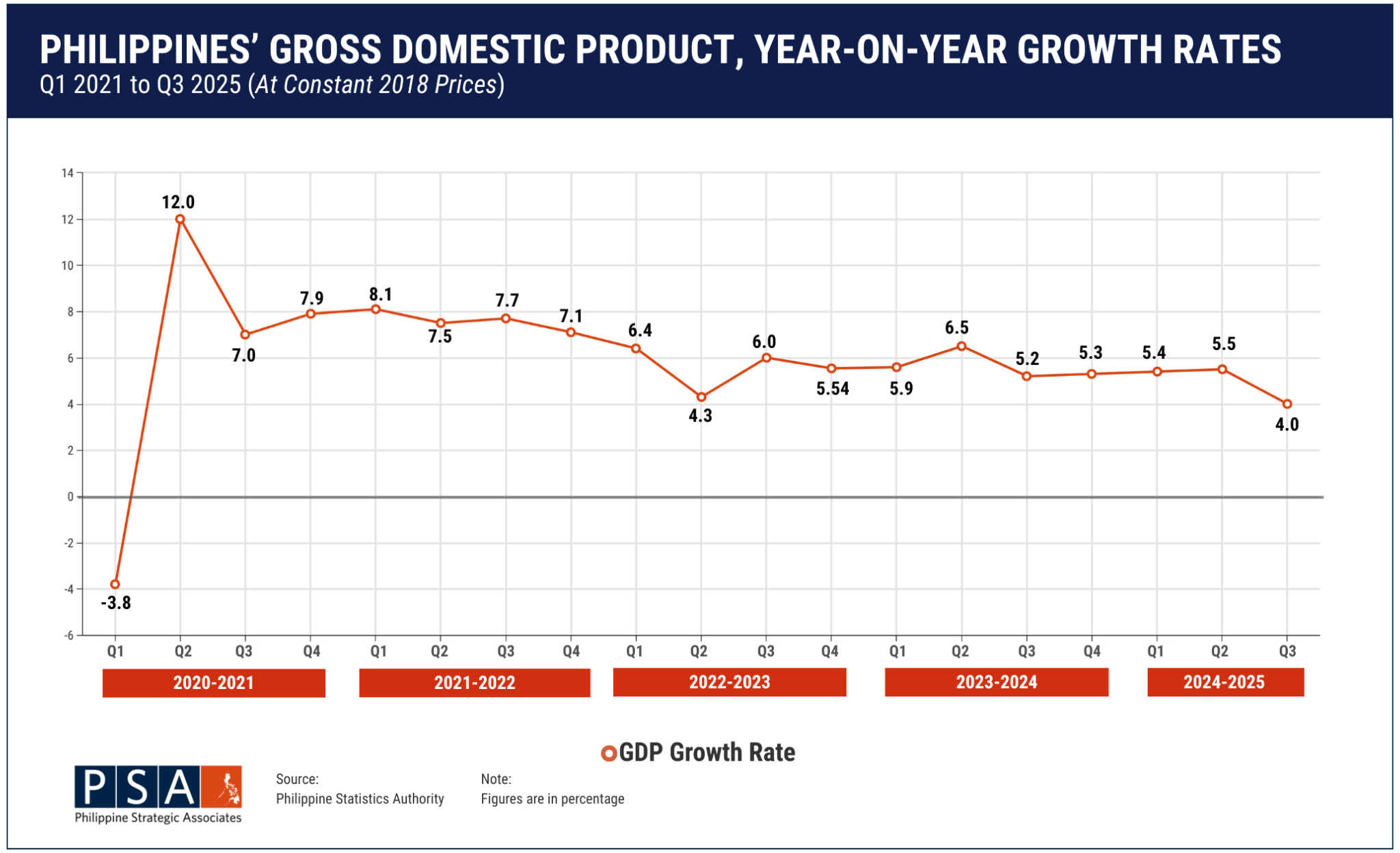 Subdued economic momentum driven by weak investor and business confidence in 2025 is highly likely to persist through 2026, and potentially until the 2028 presidential elections. Philippine economic growth is at 5 percent for the first three quarters of 2025, making the 5.5 to 6.5 percent administration growth target of the year difficult to attain, unless the Philippine economy grows by 7.1 percent in the last quarter of the year. The first two quarters of 2025 saw moderate growth for the Philippines at 5.4 percent and 5.5 percent respectively. But this slowed down in the third quarter, with gross domestic product (GDP) growth sliding to a four-year low of 4 percent. This slowdown was attributed to the public infrastructure corruption issue, which dampened government spending, household consumption, and investor confidence.