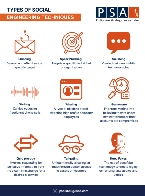 Social engineering techniques are manipulation tactics employed by threat actors to exploit human error and gain unauthorized access to networks, systems, or sensitive data. These attacks rely on direct or indirect communication (whether online or in-person) between the threat actor and the victim, aiming to motivate individuals to unwittingly compromise themselves. Unlike brute force methods, social engineering relies on manipulation, making it a critical component to cybersecurity incidents. Some common types of Social Engineering Techniques include the following:
