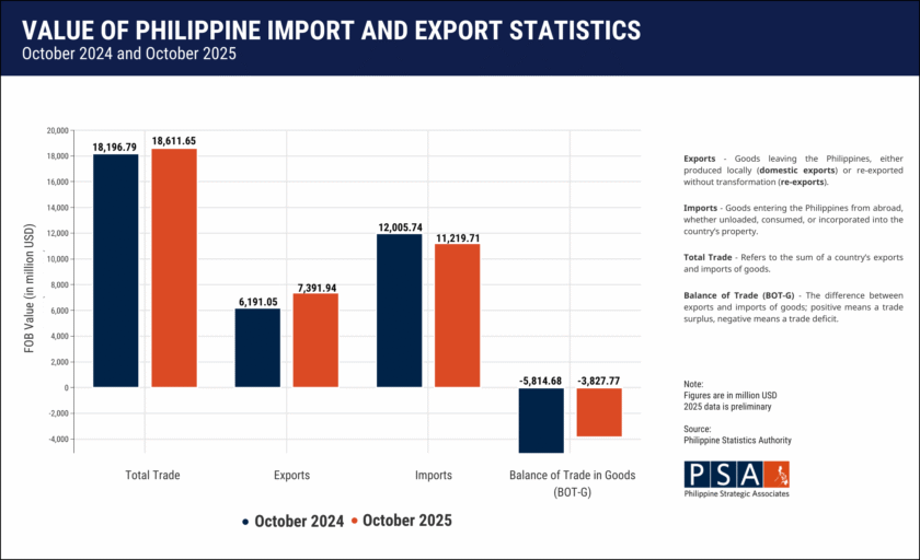 The Philippines’ trade deficit narrowed to USD 3.83 billion (PHP 225.84 billion) in October 2025, down by 34.2 percent from the USD 5.81 billion (PHP 342.57 billion) deficit in October 2024. The lower deficit was in part due to a strong export performance driven by peso depreciation in the said period.