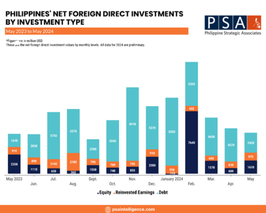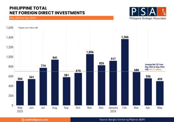 Preliminary reports from the Bangko Sentral ng Pilipinas (BSP) showed that the Philippines is on track to have a relatively average year in terms of FDI, with a decrease of approximately 1.0 percent compared to this point last year. Net FDI inflows decreased from USD 504 million in May 2023 to USD 499 million in May 2024.