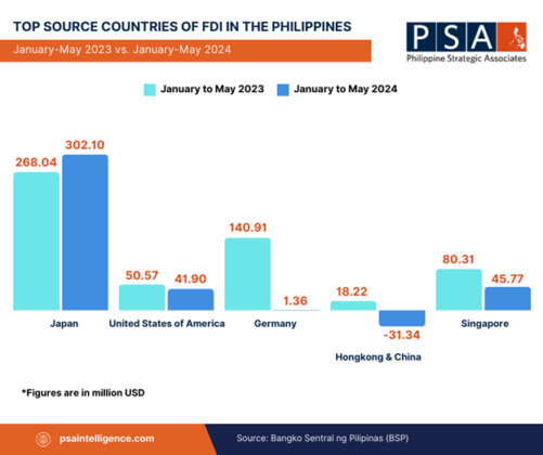 This graph compares FDI sources in the Philippines between January-May 2023 and January-May 2024. Japan held its position as top investors throughout both periods, with Japan increasing its investment slightly in 2024. Notably, investments from the United States, Germany, Hong Kong and China, and Singapore declined in 2024.