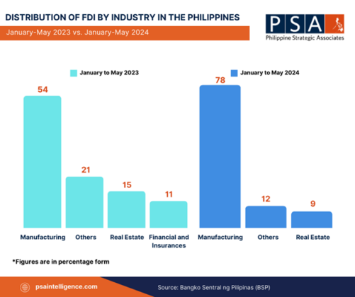 Manufacturing dominated FDI in the Philippines from January to May 2023 and 2024, showing growth in 2024. The “Others” category declined slightly. Real estate held steady, while financial and insurance sectors saw minor decreases.