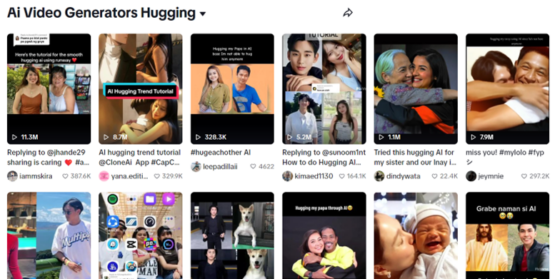 Later this year, a new trend on Tiktok and other social media platforms stormed the internet: AI hugging videos. These videos are created using AI tools that combine static photos of people or animals (and in some instance, cartoon or anime characters) recreating a virtual hug that is made to look almost real. These videos are generated using various tools online that are readily available to the public. There is currently a growing trend of online users utilizing this technology and posting their contents on various social media sites.