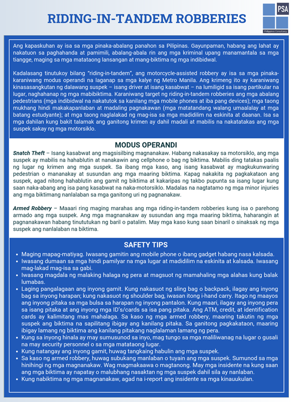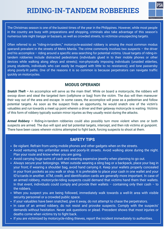 Out of the nine kidnapping-related incidents recorded in October, three occurred in Metro Manila. Two of these incidents were debt-related abductions involving Chinese and Taiwanese victims. Meanwhile, another kidnapping recorded in Parañaque City involved the abduction and rape of a 22-year old Filipina.